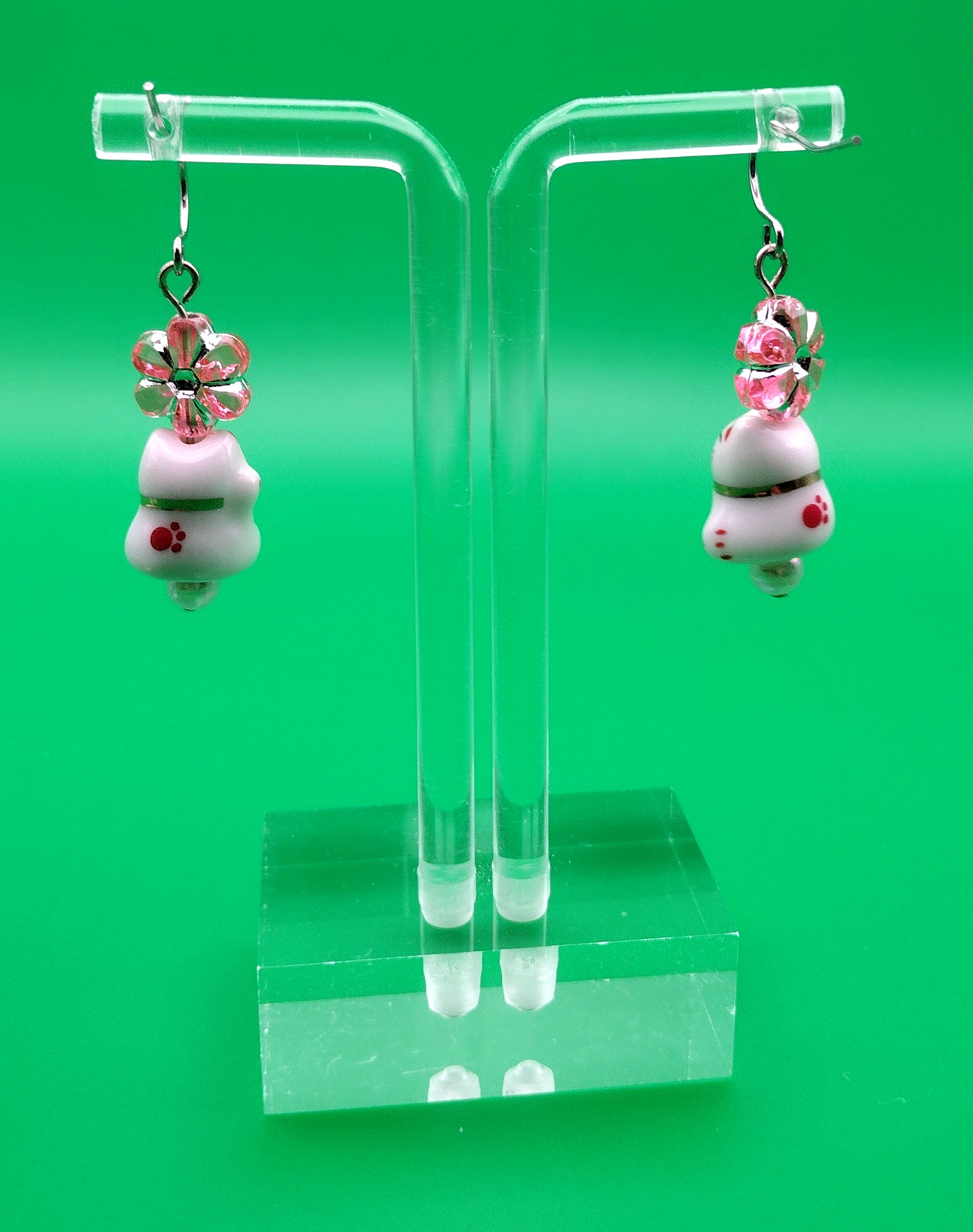 These playful earrings showcase a pink acrylic flower resting on either a pink bunny or a lucky beckoning cat.