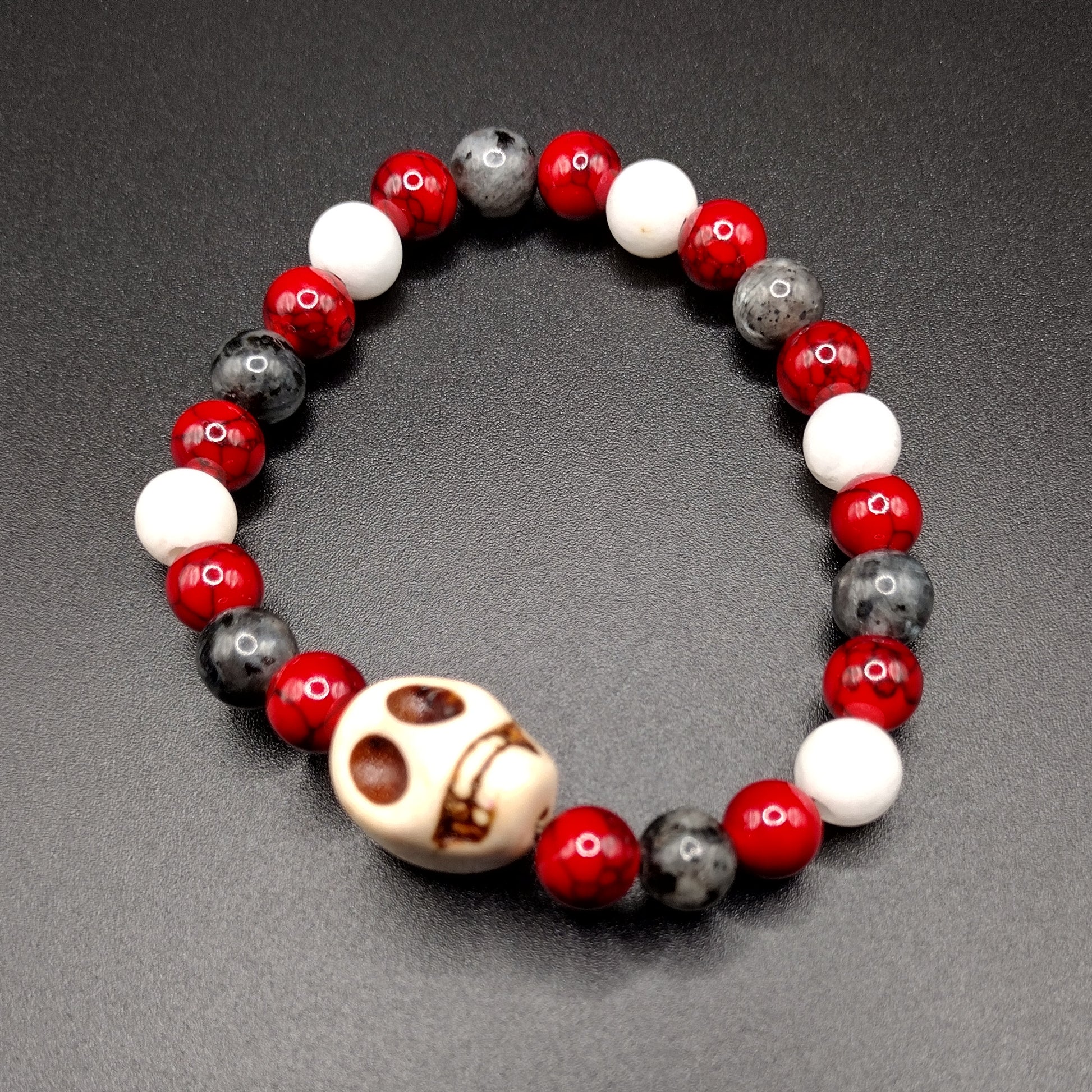 Bold contrasts of white moonstone, larvikite, and deep red-dyed quartz beads with a carved white skull centerpiece. A daring accessory that blends fire and bone, this stretch bracelet captures gothic flair with a touch of rebellious energy. Length is 7 inches.