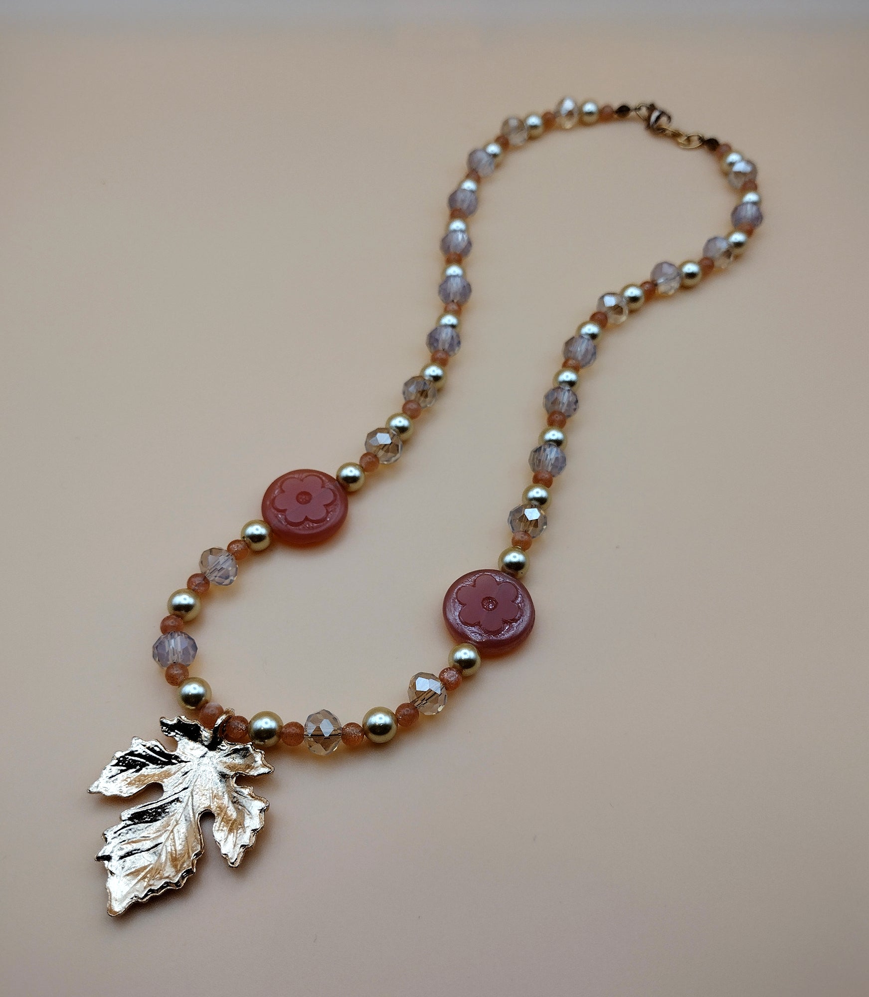 Feeling like I hadn't made enough orange jewelry in my life, I decided to try my hand at this as soon as I saw the lovely gold toned maple leaf and the cute flowered coin beads. Vibrant sunstone beads complete this warm weather look.