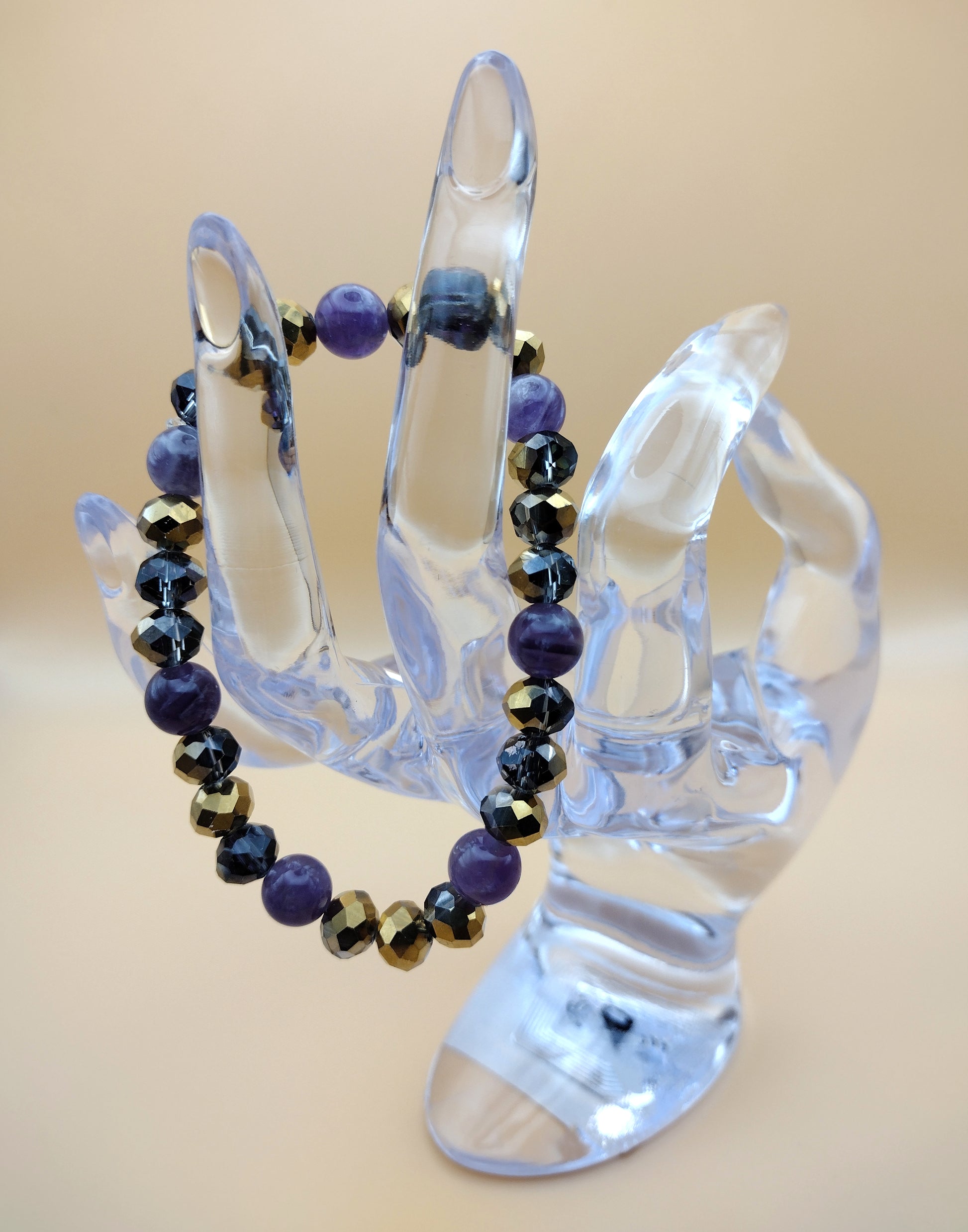 Reflekt: Majesty embodies quiet confidence, spiritual depth, and regality — a bracelet for those who carry power with grace. Features amethyst for long associated with wisdom, clarity, and inner calm along with purple/gold faceted beads.