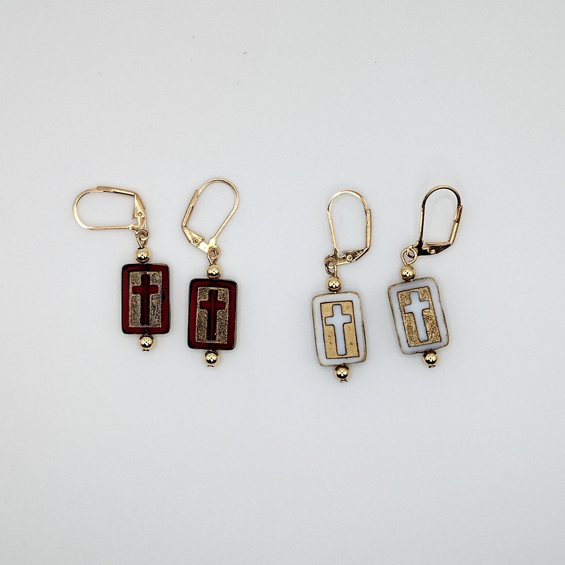 Elegant and faith-inspired cross earrings available in ivory/gold and crimson/gold. Hand-assembled with care, these earrings are a stylish way to wear your faith daily.