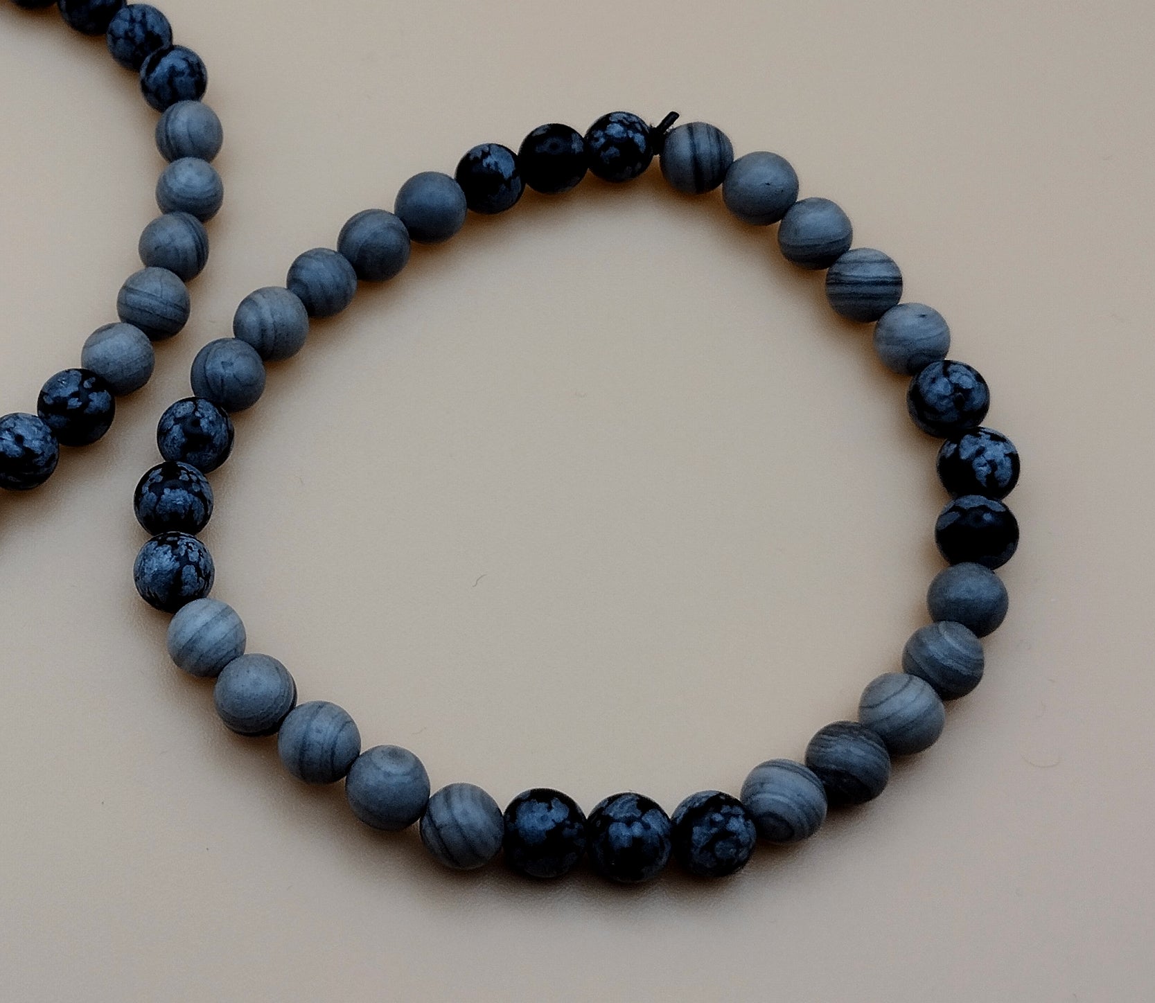 Elegant Snowflake Obsidian & Silver Line Jasper Bracelets feature striking black stone with crystalline white patterns paired with distinctive silver veined jasper. These natural stone bracelets offer a sophisticated style. Each piece showcases unique variations in a versatile monochromatic palette suitable for any ensemble.