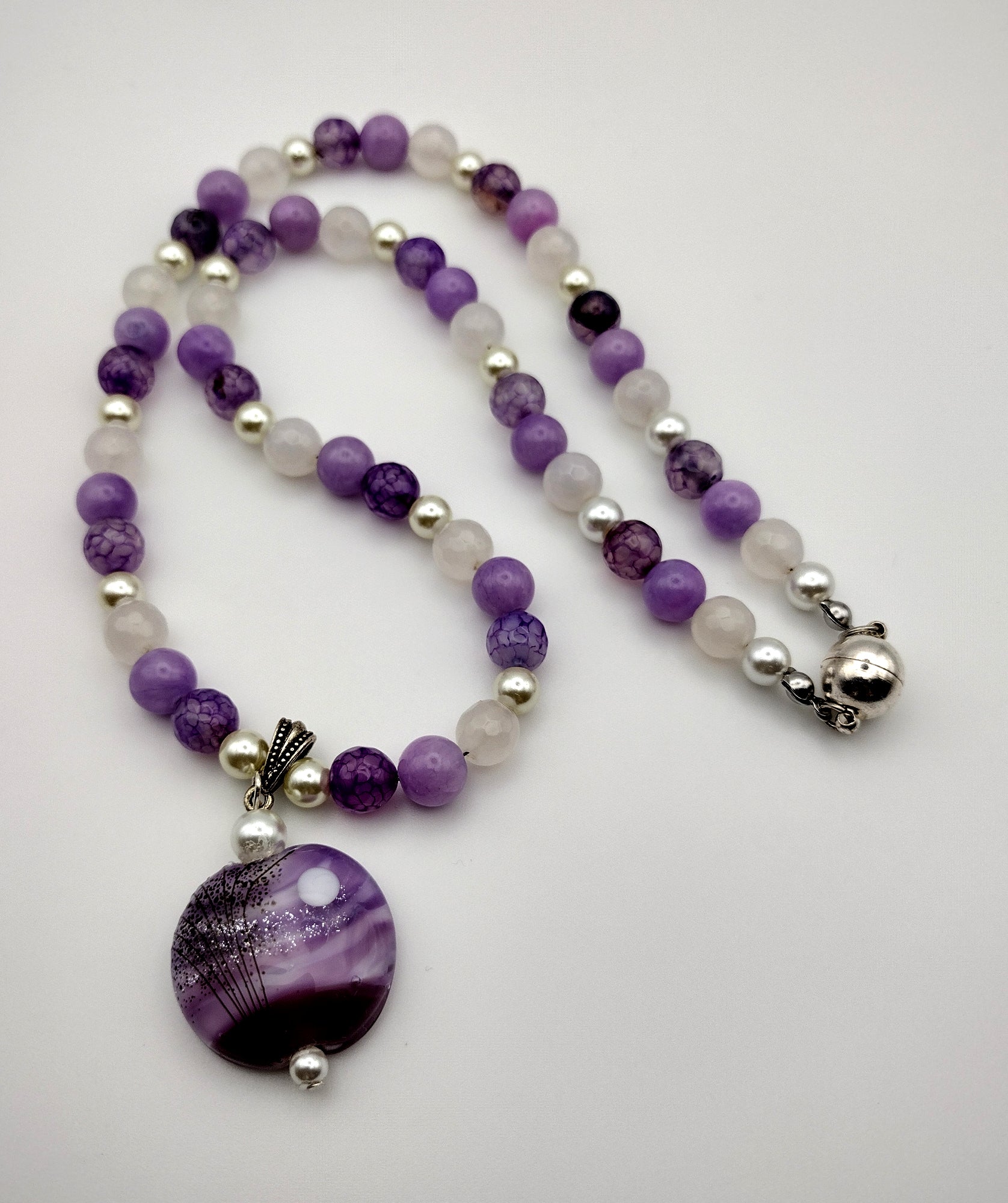 This focal features a beautifully, serene violet moonlit scene. The skill and time that goes into making the handcrafted lampwork focal elevates the elegance and beauty of this piece with this necklace giving a a tropical island feel.